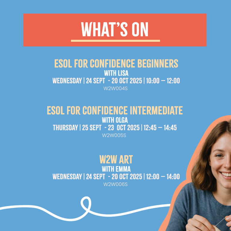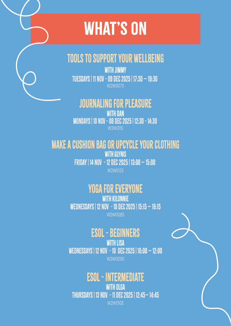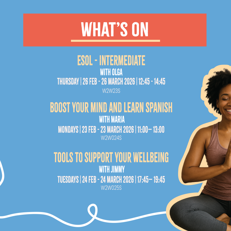 Each course is guided by a supportive Wellbeing Coach, ensuring you get the encouragement and advice you need. From mindfulness and art to computer skills and language support, there’s something for everyone. You don’t need any previous experience or qualifications – just bring yourself and an open mind.